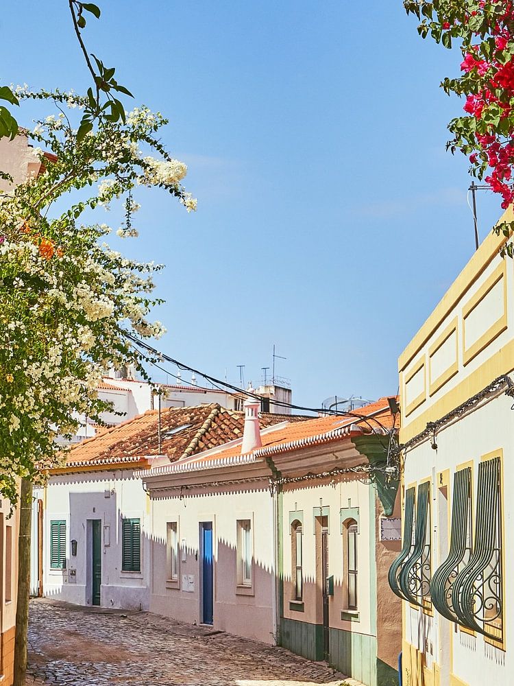 Cette photo me rappelle un peu un diorama. Cette rue pavée qui s'incurve dans le virage, donne de la profondeur. Les lauriers roses au premier plan ajoutent à cet effet. Ces petites maisons. Il s'agit d'une rue d'un village de pêcheurs de l'Algarve, au Portugal. Une image de diorama avec un air de vacances.