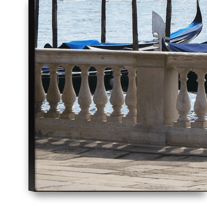 Attachées aux piliers, plusieurs gondoles vénitiennes classiques, aux formes fines et allongées, se balancent légèrement dans l'eau. Recouvertes de housses bleues, les gondoles sont rehaussées de noir. Leur proue gracieusement incurvée témoigne du savoir-faire des gondoliers. Chaque gondole repose tranquillement, attendant ses passagers, leur reflet scintillant dans les douces vagues.