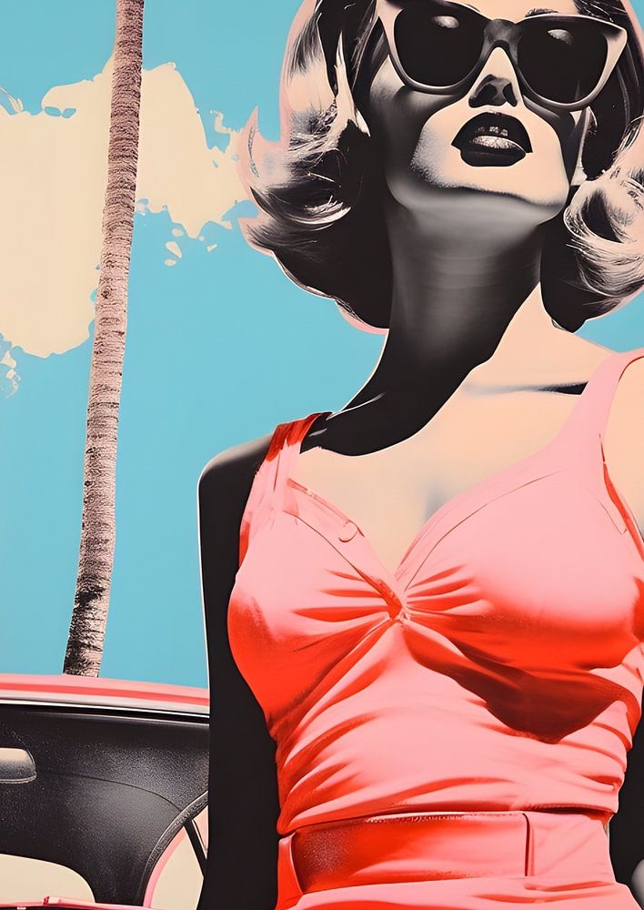 Achetez cette œuvre d'art Popart Une star hollywoodienne en voiture de collection par Rosa Piazza sur toile, aluminium, ArtFrame ou photographie (encadrée), impression d'art en haute qualité et tout format.