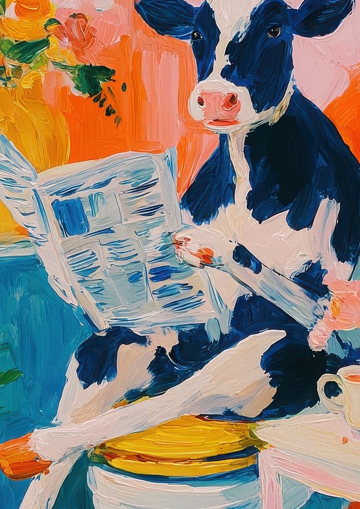 Cette peinture acrylique représente une adorable vache noire et blanche assise sur la cuvette ouverte des toilettes et lisant un journal. La pièce lumineuse est décorée en rose pastel, complétée par une table jaune, un canapé bleu et des fleurs dans des vases. Des touches de rose et d'orange donnent de la vivacité à la scène. Des coups de pinceau puissants et le travail au Palette Knife et à la craie grasse créent de la texture et de la profondeur. La représentation réduite et expressive combine une illustration animalière humoristique avec un intérieur coloré et bizarre, créant une atmosphère charmante et ludique, pleine d'énergie et de joie visuelle.