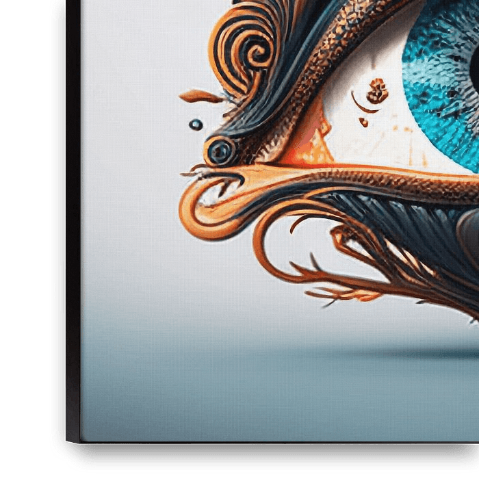 Au centre de cette œuvre d'art captivante se trouve un œil bleu surréaliste qui combine des éléments naturels et fantastiques dans son design. L'iris brille avec des motifs vivants et complexes de bleus océaniques et de tons aquatiques, créant un point de mire fascinant. Autour de l'œil s'étend un cadre de formes organiques entrelacées…