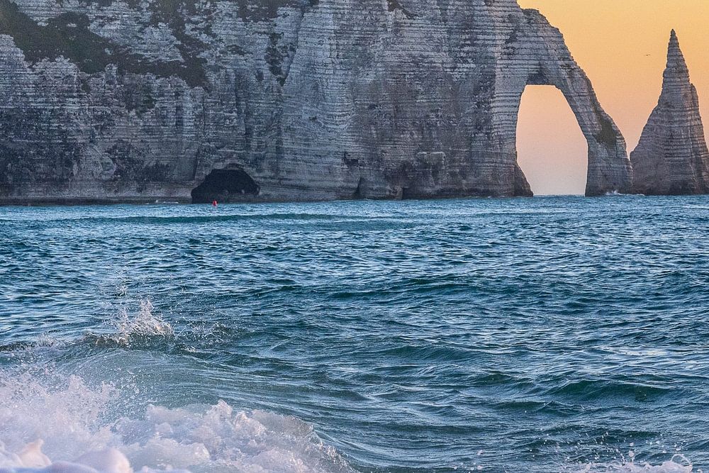 Les vagues s'écrasent sur la plage de galets avec en arrière-plan le rocher, l'éléphant, d'Etretat