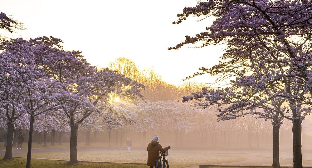 Ces photos ont été prises le 25 mars 2025. C'était un matin brumeux qui crée une atmosphère mystique. J'étais ici dès 6 heures du matin car c'est à ce moment-là que tout est calme. J'ai d'abord pris des photos de brouillard'puis j'ai attendu que le soleil se lève. C'est alors que l'on obtient des harpes solaires et des ombres longues. J'ai également pris des photos avec des gens, pour montrer comment ils vivent le parc des cerisiers en fleurs.