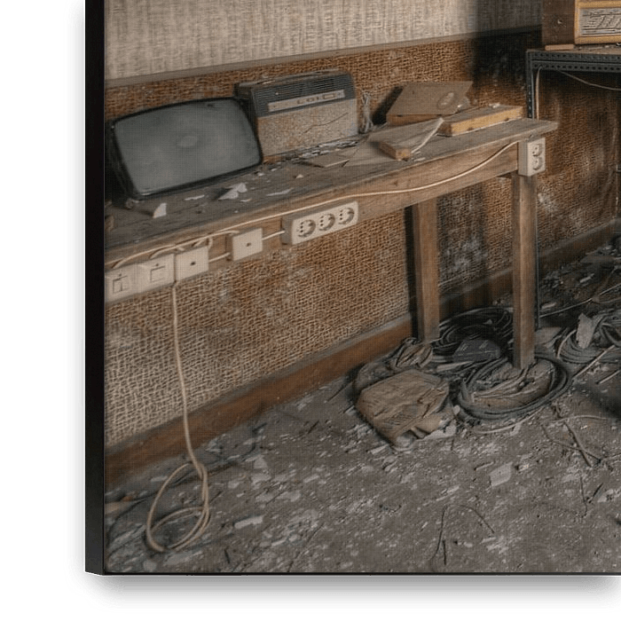 Oude radio's en een tv in een verlaten huisje.