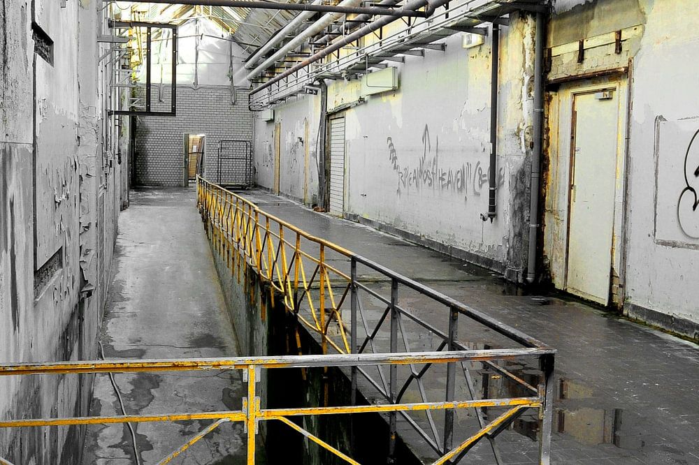 Usine Aabe de Tilburg avec clôture jaune. dans le couloir usé par les intempéries de cette usine de couvertures en laine emblématique du 20e siècle. L'histoire des Pays-Bas sur votre mur. Impression en noir et blanc avec la clôture jaune mise en évidence comme détail.