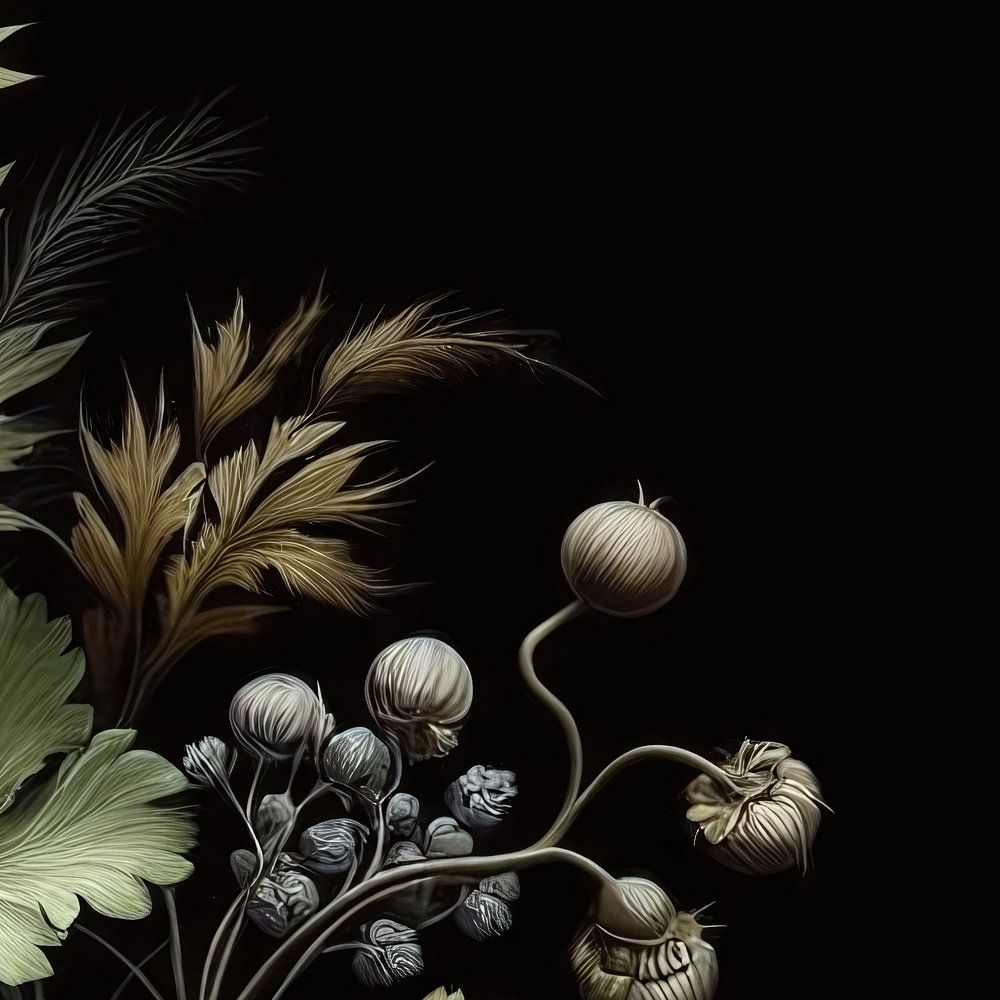 Version D4b. Ma nature morte botanique présente une multitude de plantes et de fleurs sur un fond noir. L'image est dominée par des tons de vert avec une touche de brun et de blanc. Les plantes sont disposées de manière lâche et organique et donnent un sentiment de beauté naturelle et de calme. ©10-2024 Pia Schneider, atelier COLOUR-VISION