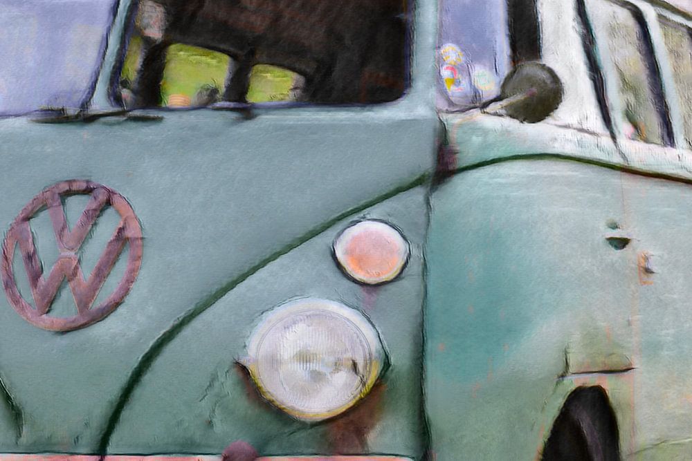 Adaptation artistique de photos'de fourgonnettes VW dans divers lieux. Ces œuvres rendent l'air du temps tangible. Des voitures robustes aux couleurs hippies. La liberté ! C'est ce que l'on ressent immédiatement en voyant ces images.