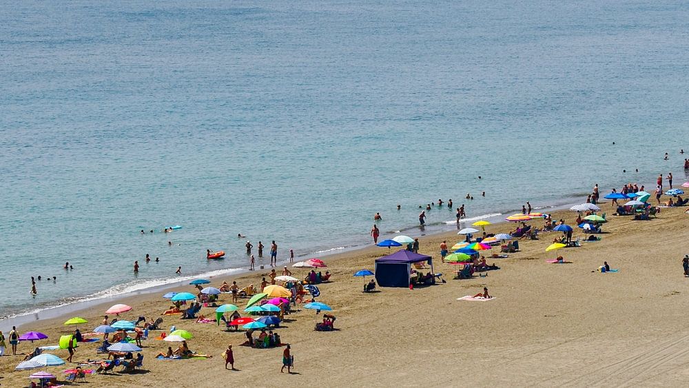 Sunbathers on the beach on the southern Spanish coast with brightly coloured umbrellas on the beach and boat on the sea.