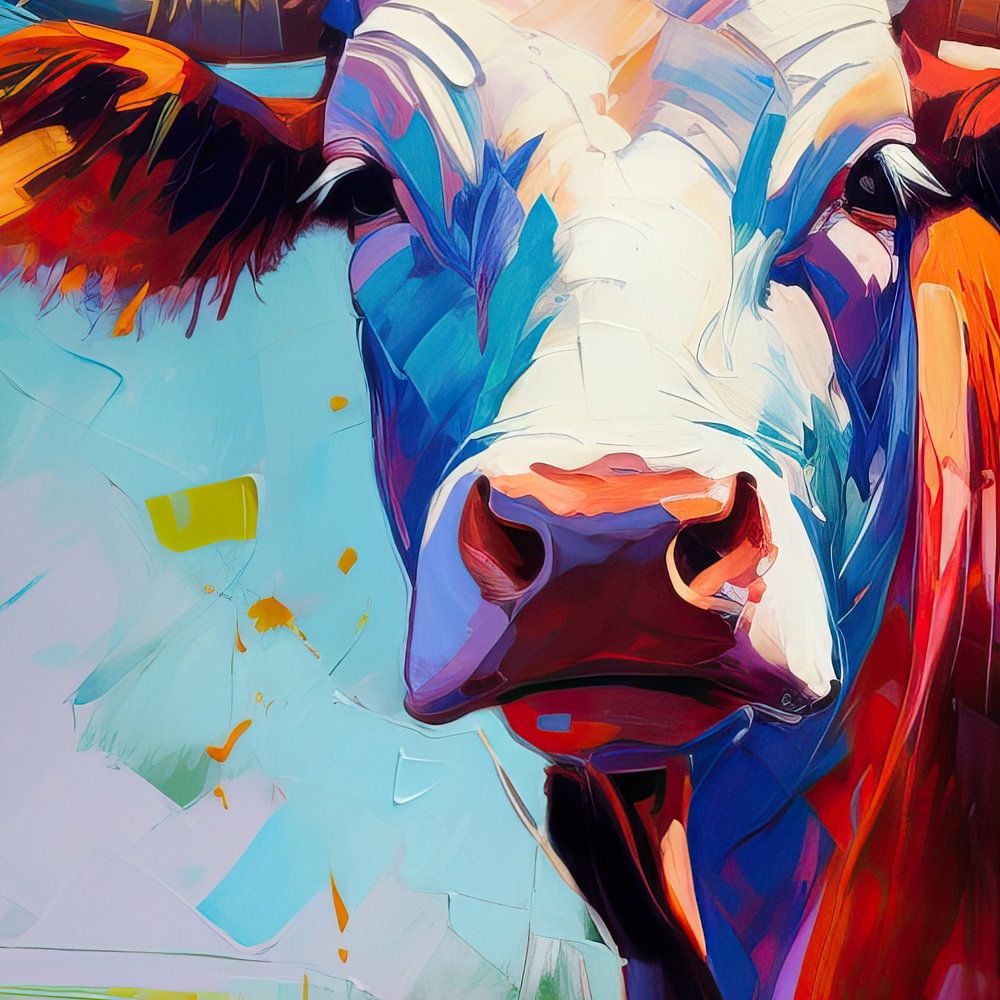 La vache est représentée par des coups de pinceau audacieux et des lignes expressives, exprimant sa forme et son apparence avec une touche contemporaine. Les couleurs vives, telles que le vert vibrant, le rose pétillant et le bleu éclatant, transmettent un sentiment de joie et de vitalité.
