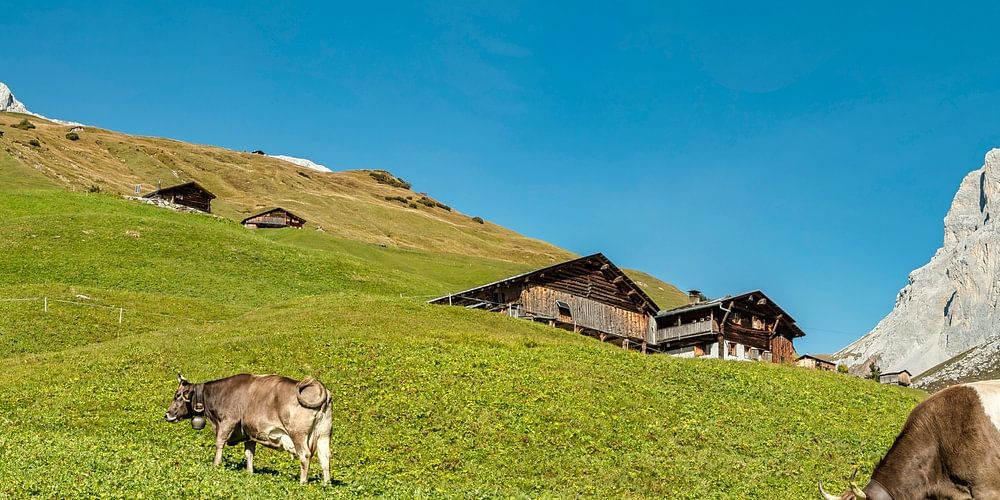 Vache au pâturage près de fermes, Schanielenbachtal avec vue sur la Schijenflue, Pratigau, Sankt Antönien, Grisons, Suisse