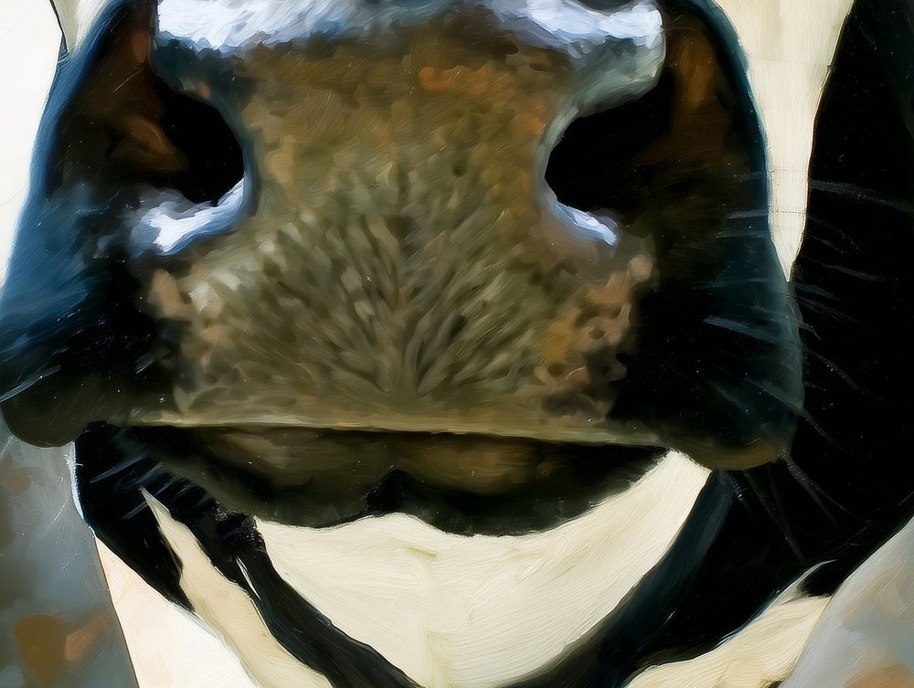 Ce tableau vous met littéralement face à une vache, si proche que vous pouvez presque la toucher. La composition est puissante et directe : le grand museau remplit le tableau et attire immédiatement l'attention. Des tons doux de crème et de blanc sont combinés avec des accents profonds de noir et de bleu, tandis que des couleurs…