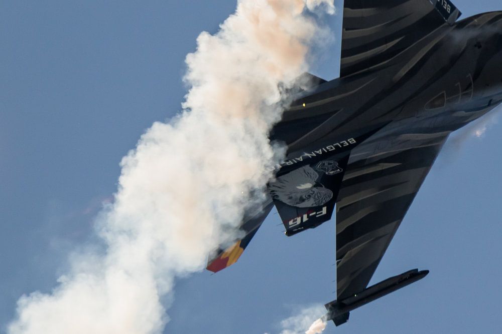 A Belgian demo F-16 (Dark Falcon), flown by Vador, at the Luchtmachtdagen 2019 (LMD 2019) or the Dutch Airforce Days 2019 at the airforcebase Volkel in the Netherlands, releasing flares.