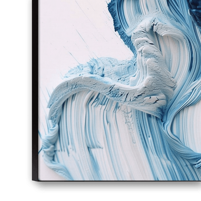 Composition abstraite composée principalement de coups de pinceau dynamiques dans différentes nuances de bleu. Les mouvements de la peinture créent des formes ondulantes, presque fluides, qui rappellent l'eau qui coule ou les nuages aériens. La texture de la peinture est clairement visible, ajoutant de la profondeur et une qualité tactile à l'œuvre. Les tons bleus contrastés vont du bleu foncé profond au bleu ciel clair, ce qui donne une impression de profondeur et de dimension. Le fond est blanc, ce qui fait ressortir les coups de pinceau bleus et crée une atmosphère fraîche et aérée. Les lignes énergiques et fluides suggèrent le mouvement et la spontanéité, donnant à l'œuvre un sentiment de liberté et d'expression.