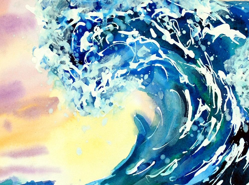Aquarelle représentant de grandes vagues bleues quelque part dans l'océan, sous un ciel coloré et un coucher de soleil.