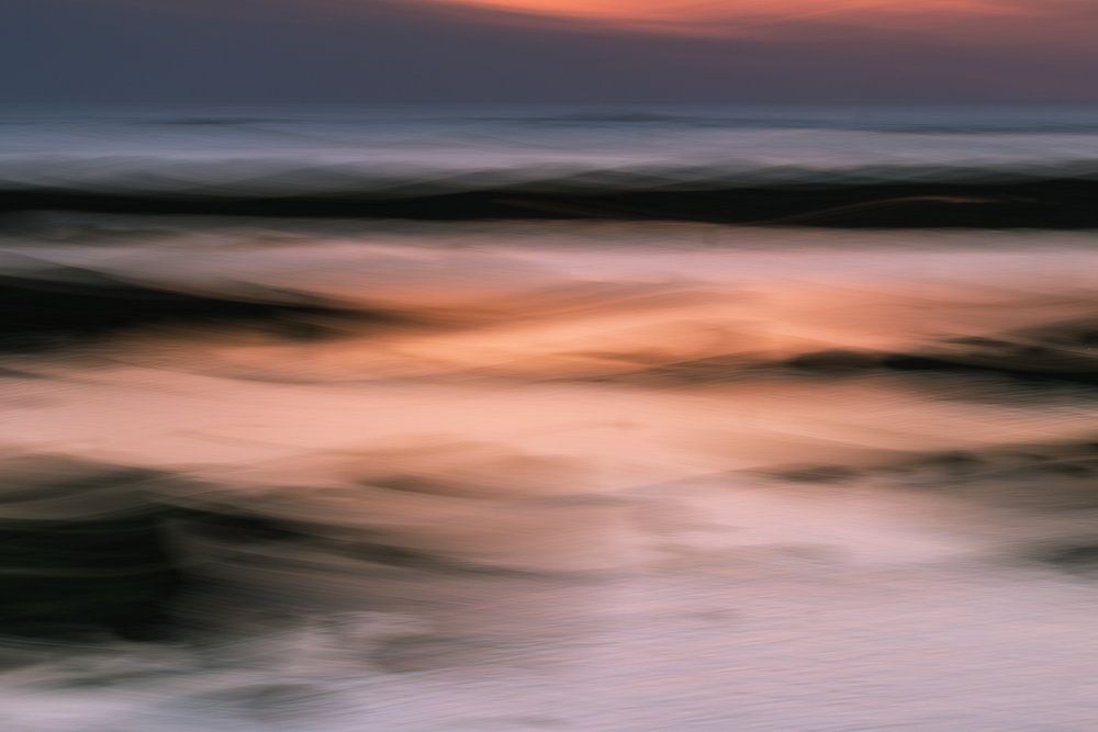 Un rendu serein et abstrait de la nature, créé avec le mouvement intentionnel de la caméra (ICM). Les couleurs douces et fluides de la plage, de la mer, des rochers et du ciel créent un paysage onirique et apaisant. Parfait pour apporter un sentiment de calme et d'équilibre à vos intérieurs.
