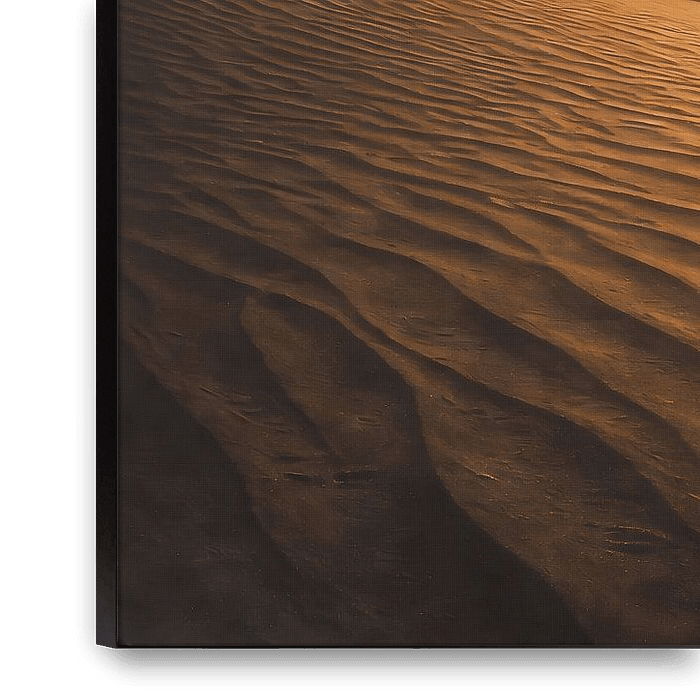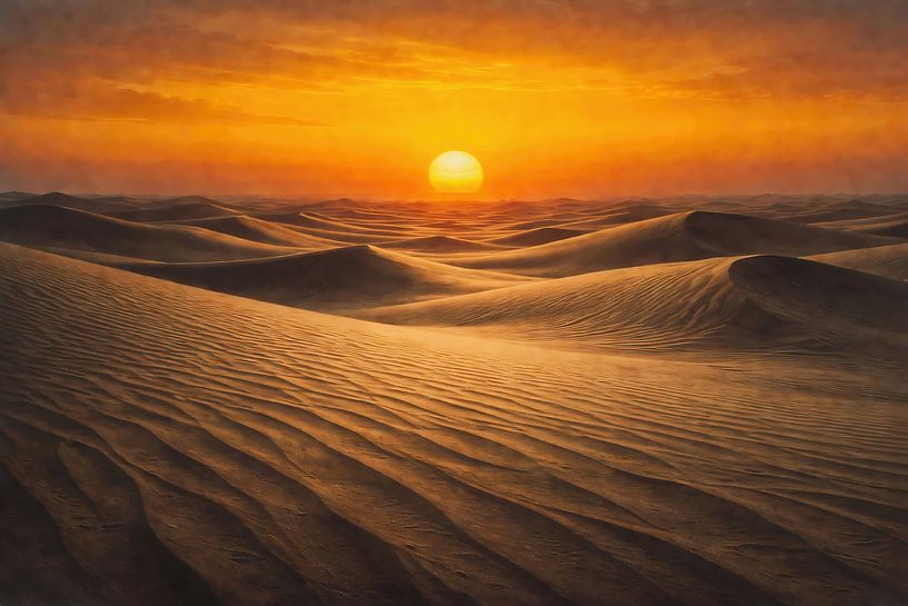 Ce paysage évocateur capture la tranquillité vibrante d'un désert étendu au moment où le soleil touche l'horizon. L'œuvre montre une série infinie de dunes ondulantes qui, comme le suggère le titre, semblent rouler sur la toile comme une mer de sable doré.