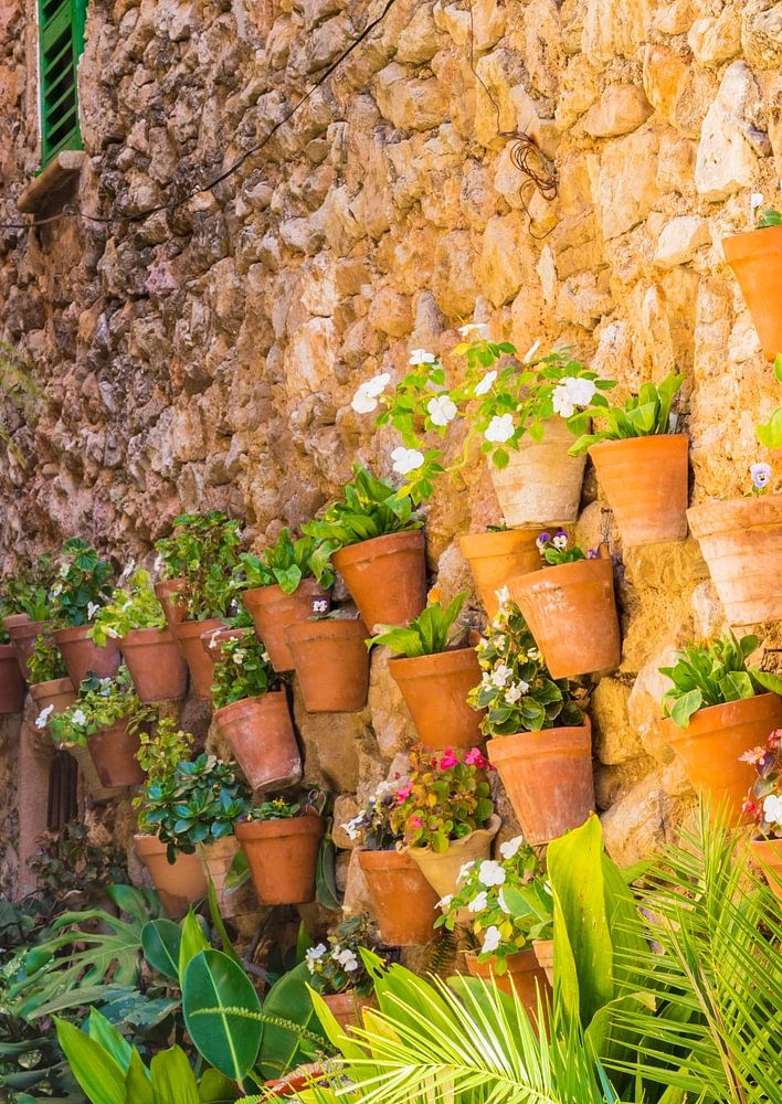 Décoration traditionnelle de pots de fleurs dans le vieux village de Valledemossa à Majorque, Espagne Îles Baléares