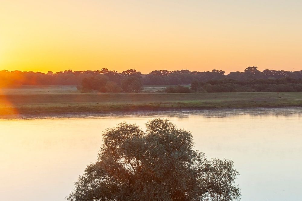 Lever de soleil sur l'Elbe, Réserve de biosphère du paysage fluvial de l'Elbe, Basse-Saxe, Allemagne