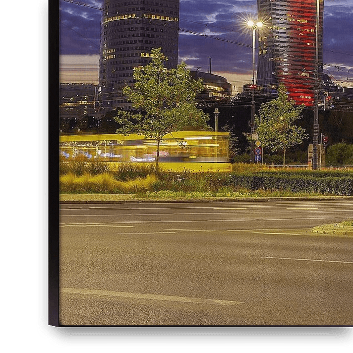 Varsovie à l'heure bleue. Le passage des tramways et l'illumination du Palais de la culture créent un spectacle de couleurs unique.