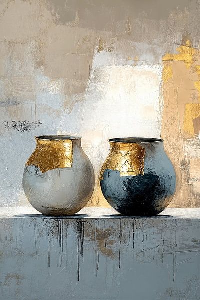 Vase - or craquelé - Cette nature morte représente deux vases à la texture riche et aux couleurs contrastées, l'un en ivoire avec des craquelures dorées et l'autre en bleu profond avec des détails dorés similaires, tous deux sur un fond abstrait mélangé de tons gris, blancs et dorés.