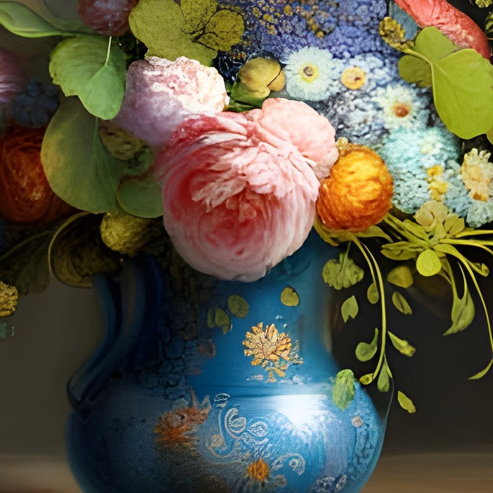 Le magnifique vase bleu rempli de fleurs inhabituelles et exotiques dans des tons doux produit une étonnante nature morte à la lumière de Rembrandt.