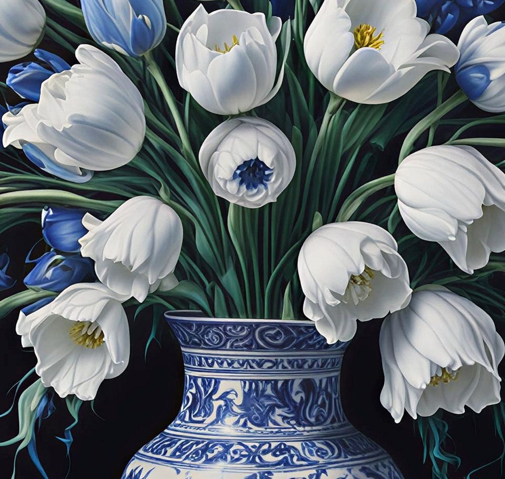 Feuilles de tulipes entourant un vase bleu delft au centre contenant de nombreuses tulipes blanches, bleues et bleu pastel sur fond noir.