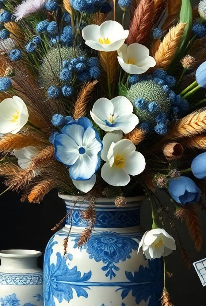 Une jolie nature morte dans laquelle un vase bleu de Delft est rempli de tulipes, d'épis de maïs et de fleurs sauvages. La combinaison de tons bleus frais, de tons dorés chauds et d'accents blancs fait de cette œuvre d'art un accroche-regard intemporel dans n'importe quel intérieur.