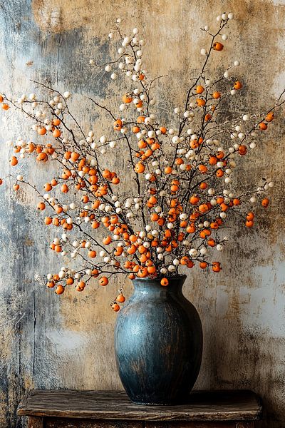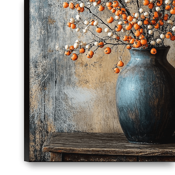 Une magnifique œuvre d'art représentant un vase rustique rempli de branches gracieuses portant des baies blanches et orange. Les couleurs chaudes et naturelles créent une atmosphère parfaite pour tout intérieur. Idéale pour les amateurs de designs classiques et rustiques, cette pièce apporte une touche de nature à votre espace.