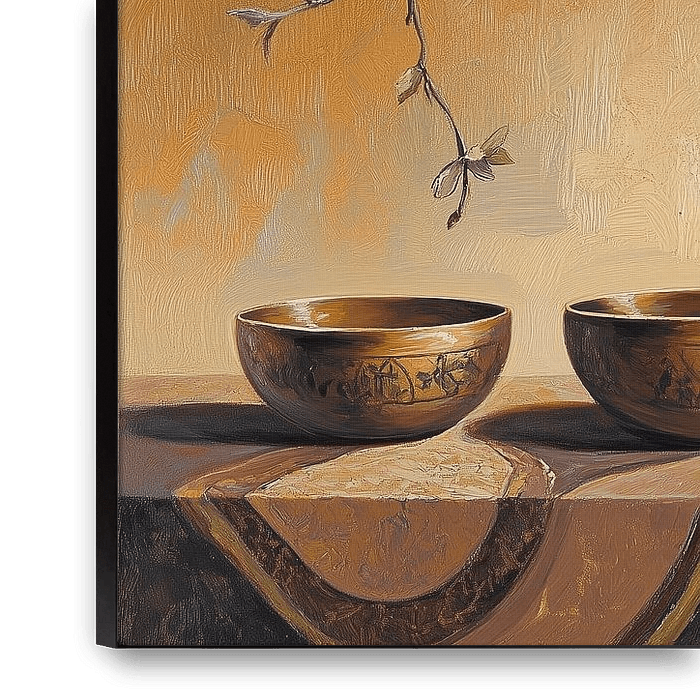 Vase et bols - Cette peinture florale représente une nature morte japandi avec un grand vase décoratif rempli de branches élancées et de fleurs blanches comme élément central, ainsi que trois bols dorés brillants sur une toile ocre-beige chaude, une peinture d'intérieur moderne, une peinture florale, une peinture de…