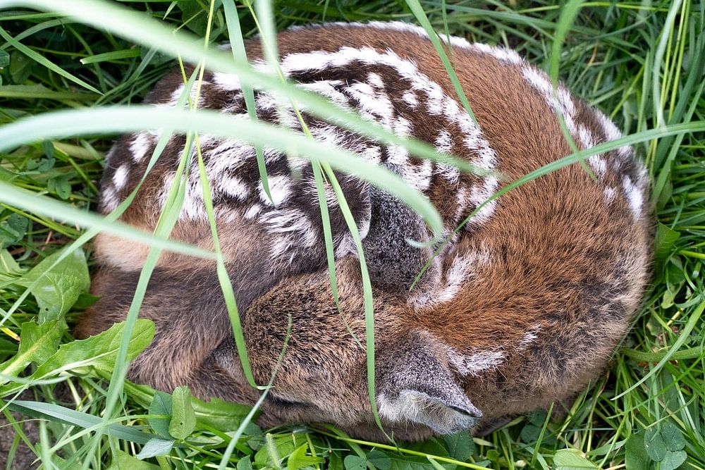 Un faon âgé de quelques jours seulement est caché dans les hautes herbes qui seront bientôt coupées. Il n'a pas conscience du grand danger que représente l'approche de la tondeuse. Les jeunes faons se pressent instinctivement contre le sol et ne s'enfuient pas, il y a donc de fortes chances qu'ils finissent sous la faucheuse. C'est pourquoi nous recherchons activement ces petits afin de les placer en toute sécurité à la lisière de la forêt. Là, la mère chèvre pourra récupérer ses petits plus tard.