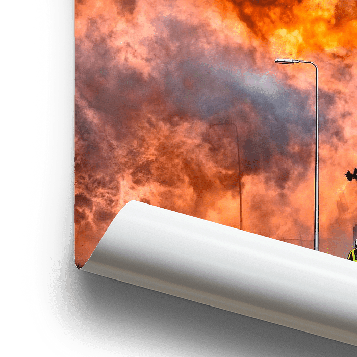 Un camion de pompiers devant un incendie dans une zone industrielle avec d'énormes flammes qui remplissent l'arrière-plan.
