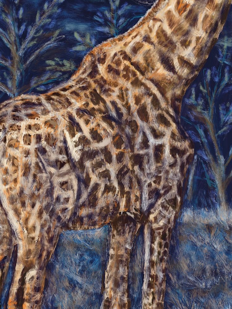 Night Watch over the Steppe est une peinture à l'huile numérique qui capture la tranquillité et la beauté de la nuit africaine. Au centre de l'œuvre se trouve une girafe, grande et gracieuse, baignée par la lumière fraîche de la lune. La steppe est immobile sous un ciel bleu profond, dans lequel la lumière joue subtilement avec les formes du paysage.