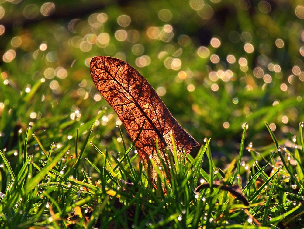 faible lumière du soleil avec la rosée du matin et une vieille feuille sur une prairie