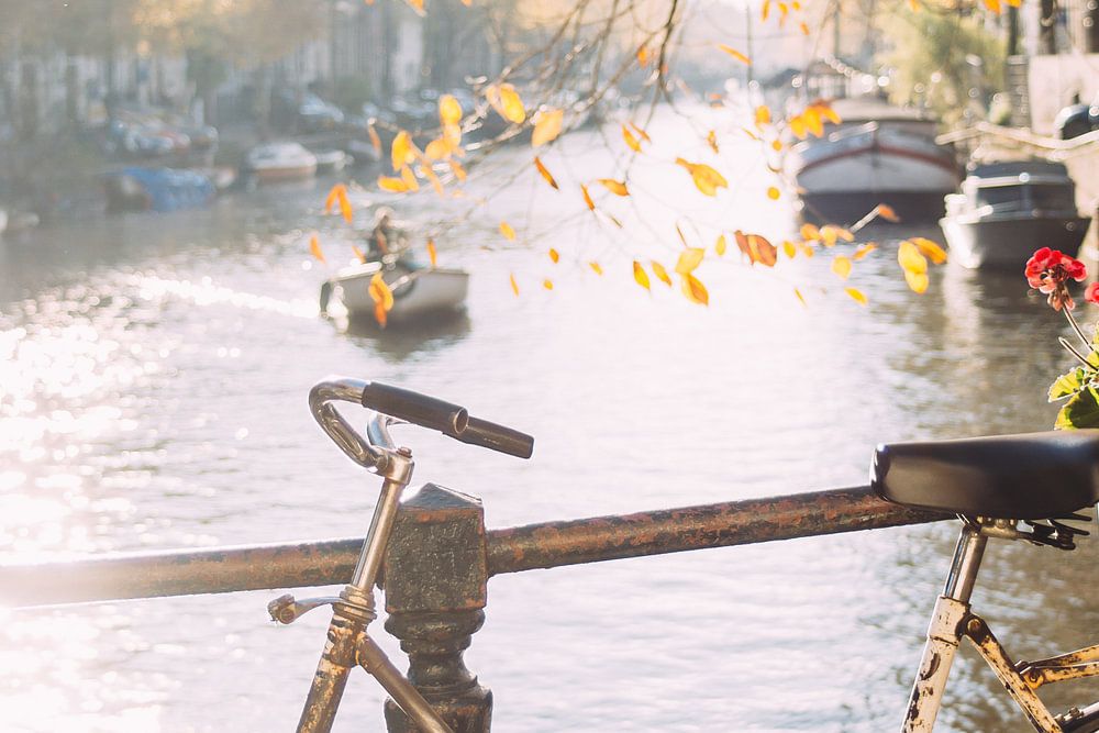 Vélo au bord de l'eau à Amsterdam sous un soleil d'automne