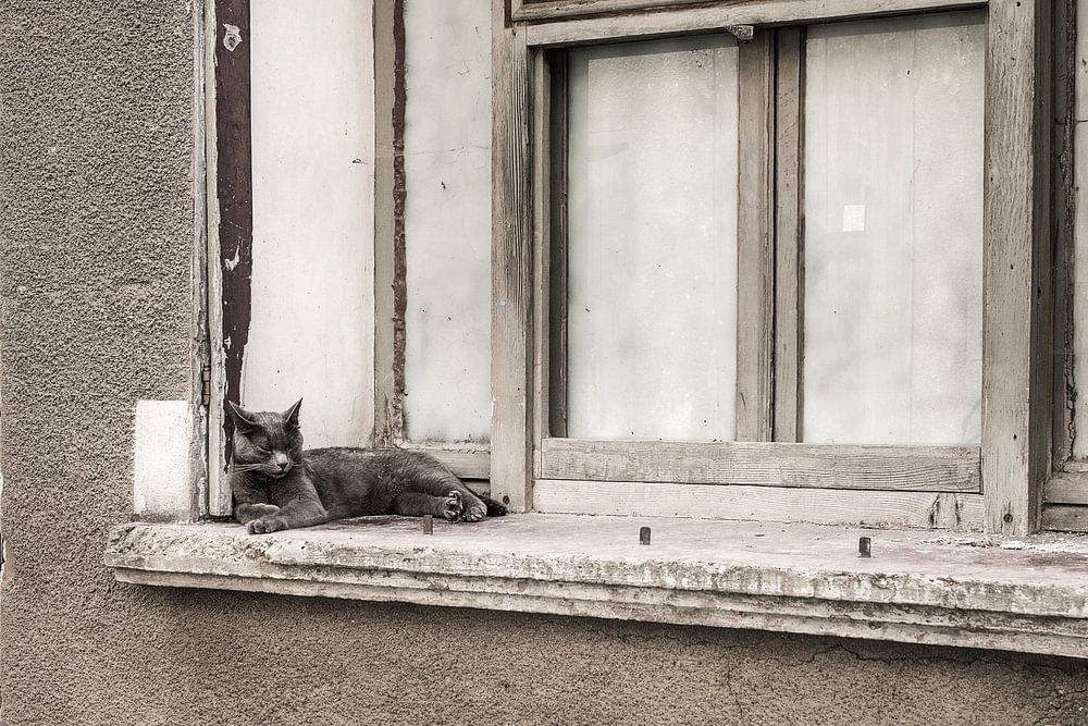 Grijze kat liggend in een vensterbank van een ouder huis in Frankrijk