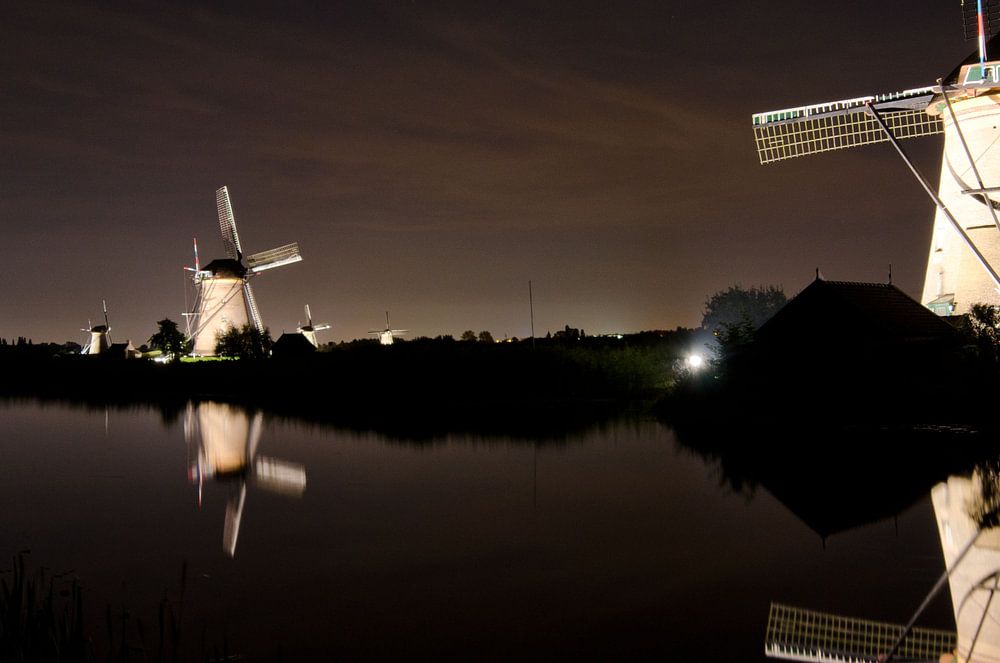Een paar avonden in het jaar zijn de wereldberoemde molens bij Kinderdijk verlicht. Dit was een mooie, heldere en windstille avond. Kinderdijk is onderdeel van het UNESCO werelderfgoed in Nederland