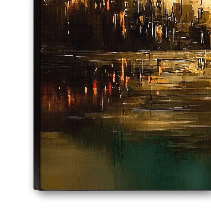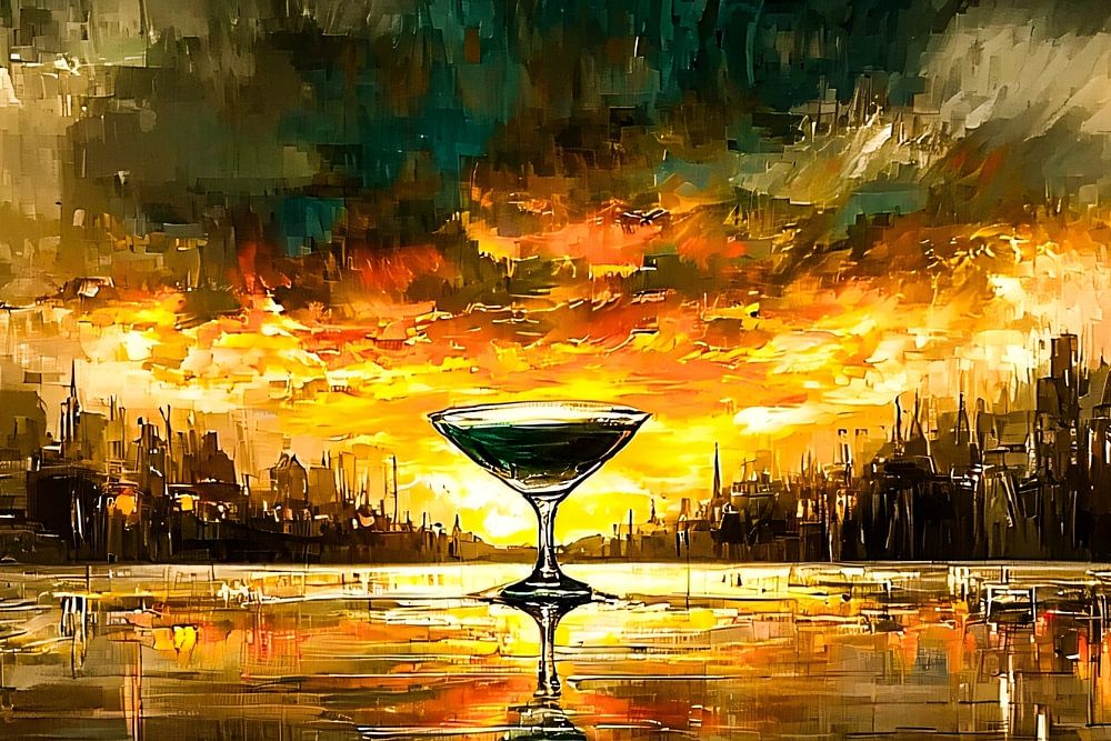 Cette œuvre d'art étonnante combine un style moderne frappant avec une atmosphère surréaliste rêveuse. Un verre au centre de la composition reflète un coucher de soleil enchanteur, tandis que la ville et le ciel environnants s'estompent dans un jeu de couleurs vibrantes. Ce motif attire tous les regards et confère une atmosphère unique à n'importe quelle pièce. Parfait pour ceux qui aiment les décorations murales dynamiques et accrocheuses, à la fois modernes et atmosphériques. Ajoutez une touche de magie à votre intérieur !