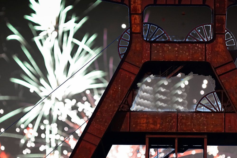 Fotocollage des Förderturmes der Zeche Pluto in Herne mit einem Feuerwerk