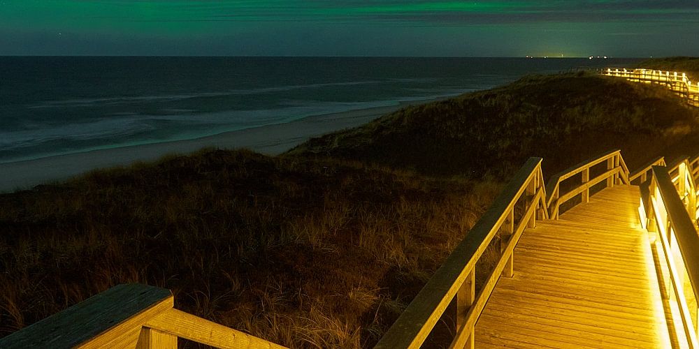 Spectacle naturel nocturne rare en Allemagne - l'escalier de la plage de Wenningstedt, brillamment éclairé, offre un beau contraste