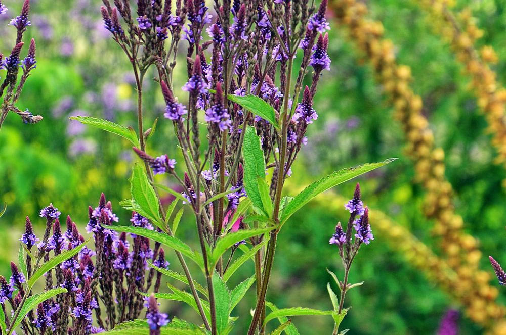 Verbena hastata, en francais: verveine, fleurs des mois de Juin à Octobre. La plante, avec ses fleurs pourpres profonds, peut obtenir plus d'un mètre de hauteur. Cette image a été faite dans un jardin semi-sauvage à Rotterdam.