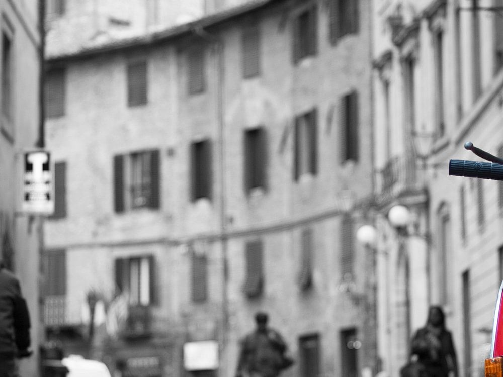 Une belle Vespa Piaggio rouge dans une charmante rue italienne en Toscane
