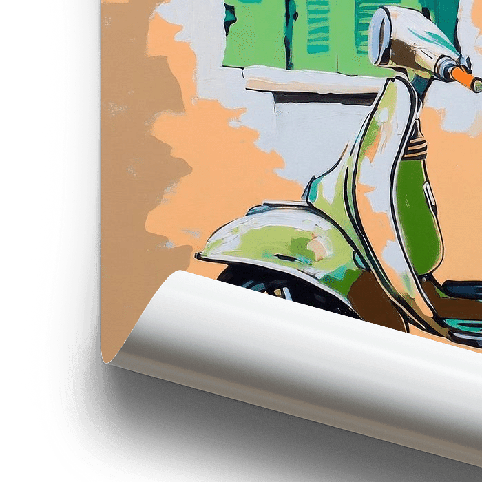 Une interaction vivante de couleurs et de formes se déploie sur un fond inondé de soleil. La Vespa verte, fraîche et accueillante, se dresse majestueusement au premier plan, tandis que les volets fleuris chuchotent des histoires mystérieuses du passé méditerranéen. Ici, le charme nostalgique rencontre la vie trépidante d'une rue…