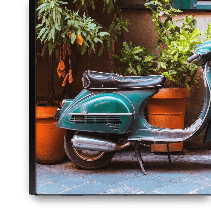 Des volets d'un vert profond encadrent l'image nostalgique d'une Vespa qui se gare avec charme parmi des plantes en fleurs. Les chauds pots en terre cuite s'intègrent harmonieusement aux douces teintes du mur et confèrent à la scène une sérénité toute méditerranéenne. Ici, le temps semble s'être arrêté, comme si les rues murmuraient des…