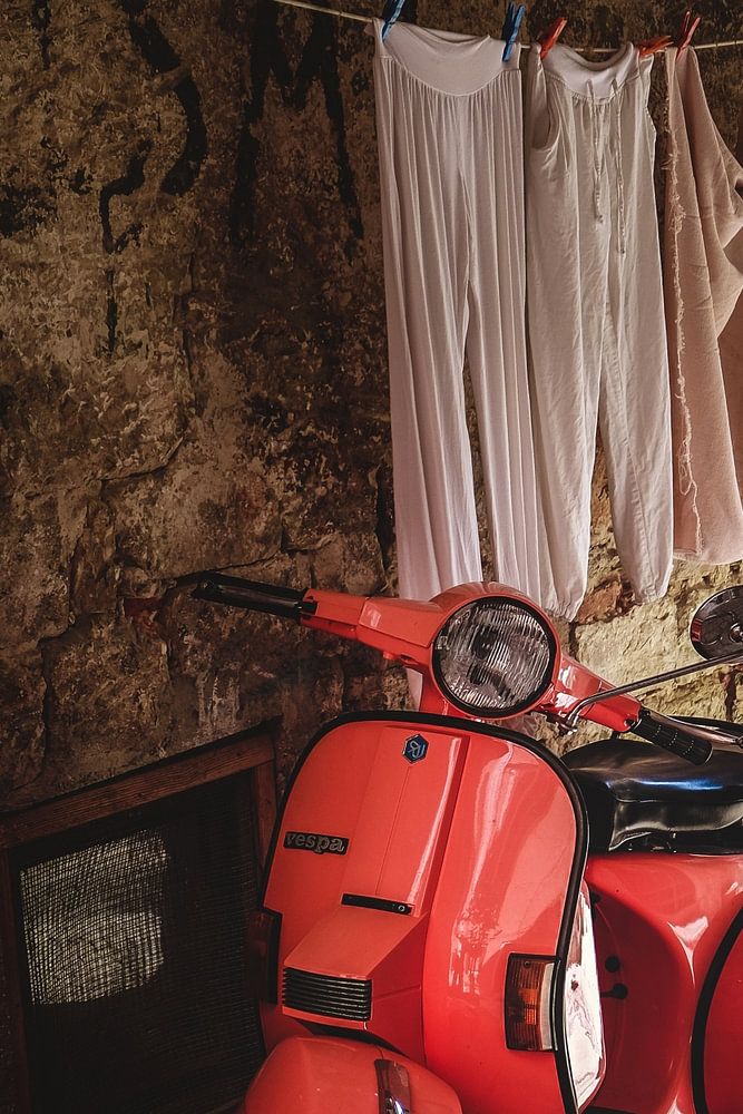Vespa rose garée sous une corde à linge dans une petite rue de Croatie