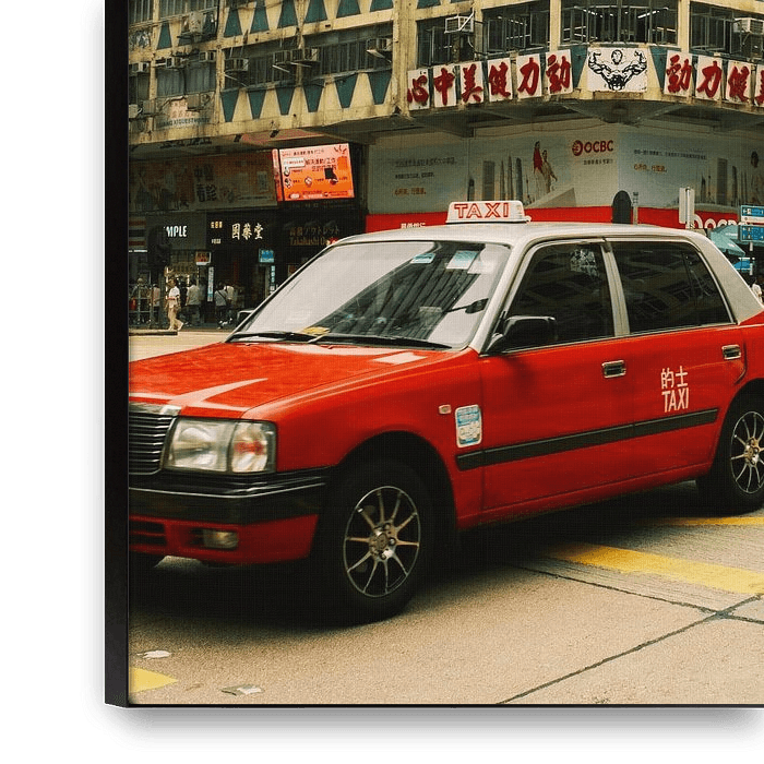 Cette image associe la vie urbaine trépidante de Hong Kong à son charme architectural marquant. Au centre se trouve le célèbre taxi rouge, symbole de la mobilité et de la vie quotidienne à Hong Kong. L'arrière-plan est marqué par un immeuble d'habitation frappant, dont la façade aux motifs géométriques et aux milliers de petites baies…