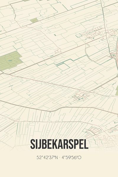 Carte rétro de Sijbekarspel, située dans la municipalité de Medemblik, province de Hollande du Nord. La carte montre les routes publiques, les cours d'eau (lacs, ruisseaux et fossés) et les forêts dans et autour de Sijbekarspel. En outre, la carte contient les coordonnées de Sijbekarspel.