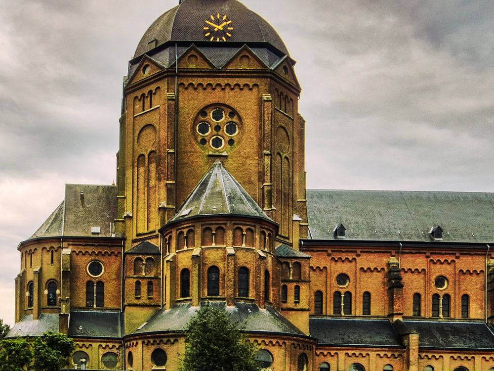 une vieille église avec une belle pelouse verte juste avant que la pluie ne commence et donc un ciel menaçant