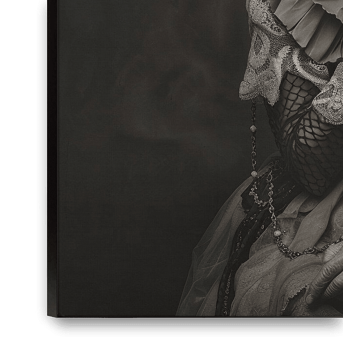 Achetez ce portrait Vieille femme avec masque en look vintage par Karina Brouwer sur toile, aluminium, ArtFrame ou photographie (encadrée), impression d'art en haute qualité et tout format.