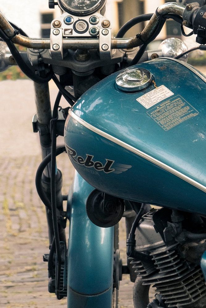Moto vintage de couleur bleu métallique sur une place du centre de Haarlem. Belle vue sur le guidon avec les anciennes jauges et la moto.