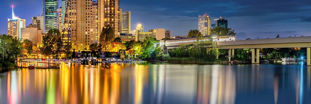 Vienne près de l'île du Danube entre UNO City et le vieux Danube, le parc du Danube et la ligne d'horizon du Danube. Panorama 310192ays